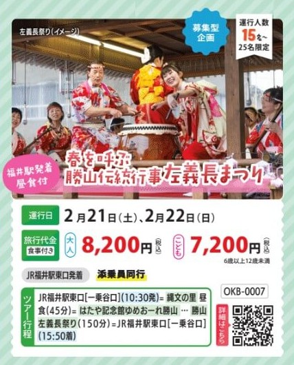 午前中は北陸の小京都と呼ばれる大野の街並みを散策。七間通りや寺町などを巡ります。午後は勝山観光!17mの大きさを誇り、1,281体の小仏群も圧巻の「大師山清大寺越前大仏」は「映えスポット」として人気で...