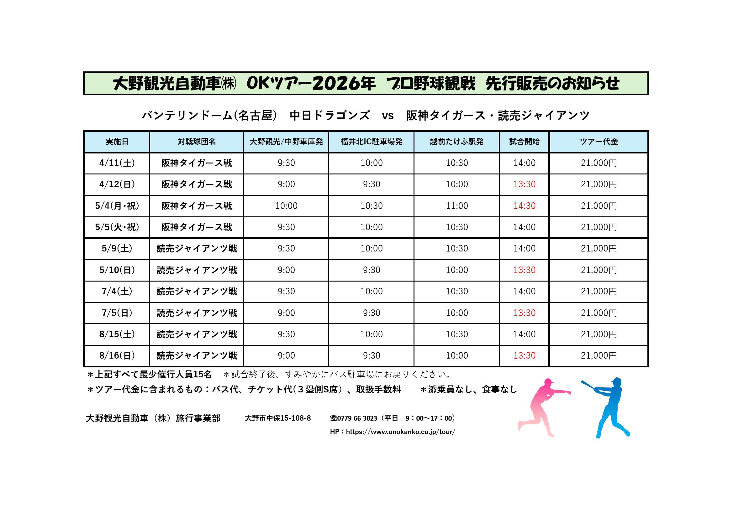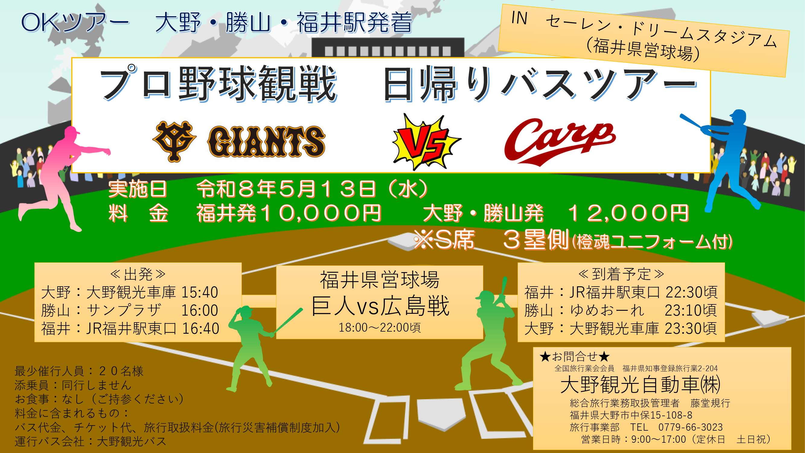 人気の中日VS阪神戦・巨人戦の3塁側S席チケット付きバスツアーです。...